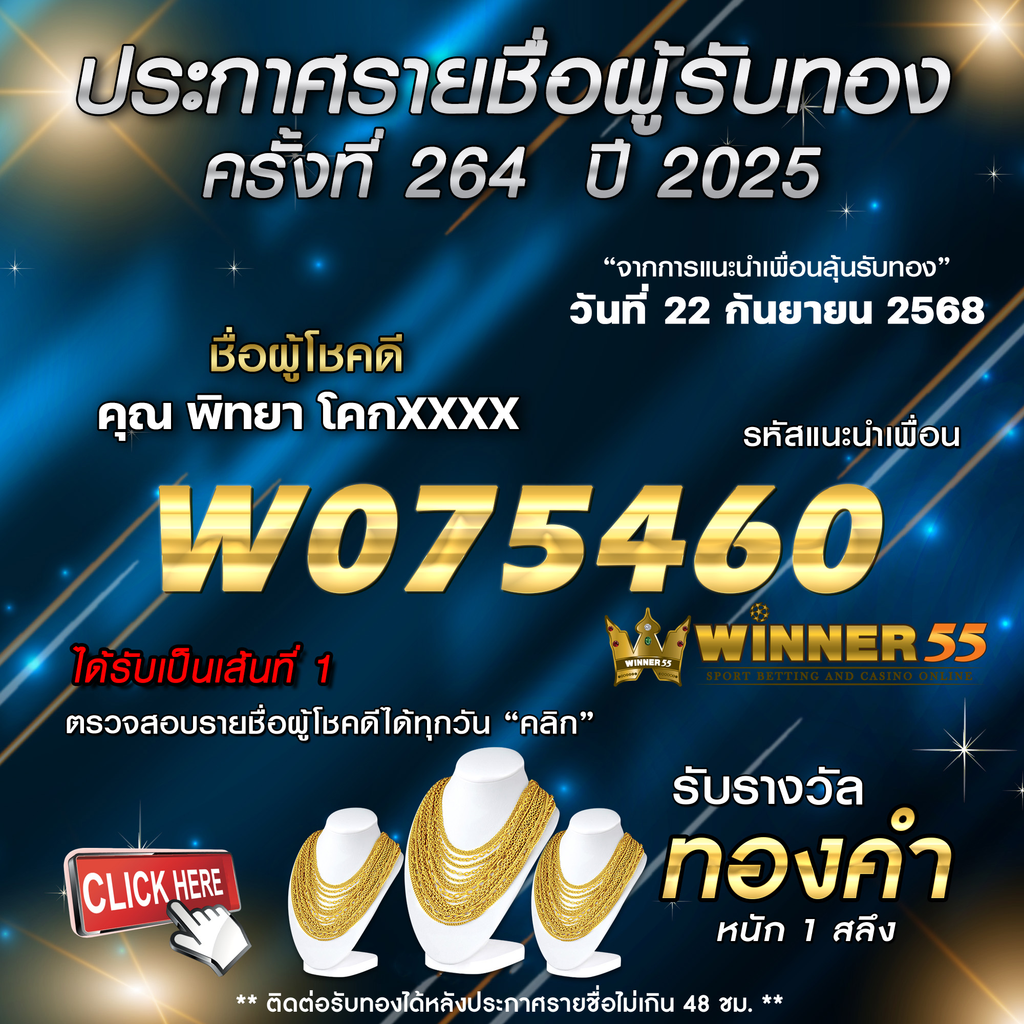 ประกาศรายชื่อผู้โชคดี สุรีย์วัฒน์ ฤทธิ์xxxx ได้รับทองคำหนัก 1 สลึง ประจำวันที่ 19 กันยายน 2568