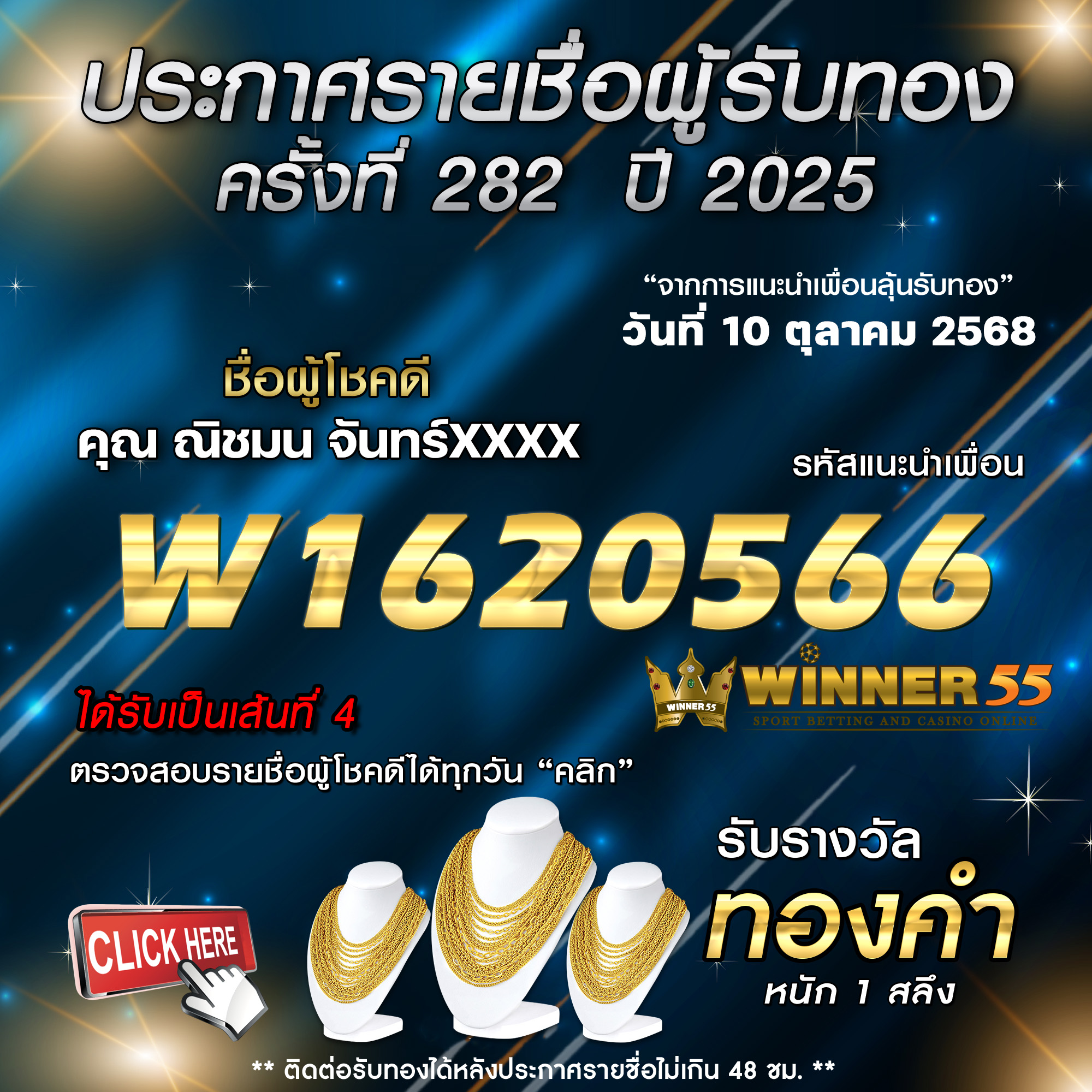 ประกาศรายชื่อผู้โชคดี ณิชมน จันทร์xxxx ได้รับทองคำหนัก 1 สลึง ประจำวันที่ 10 ตุลาคม 2568 10/10/2025